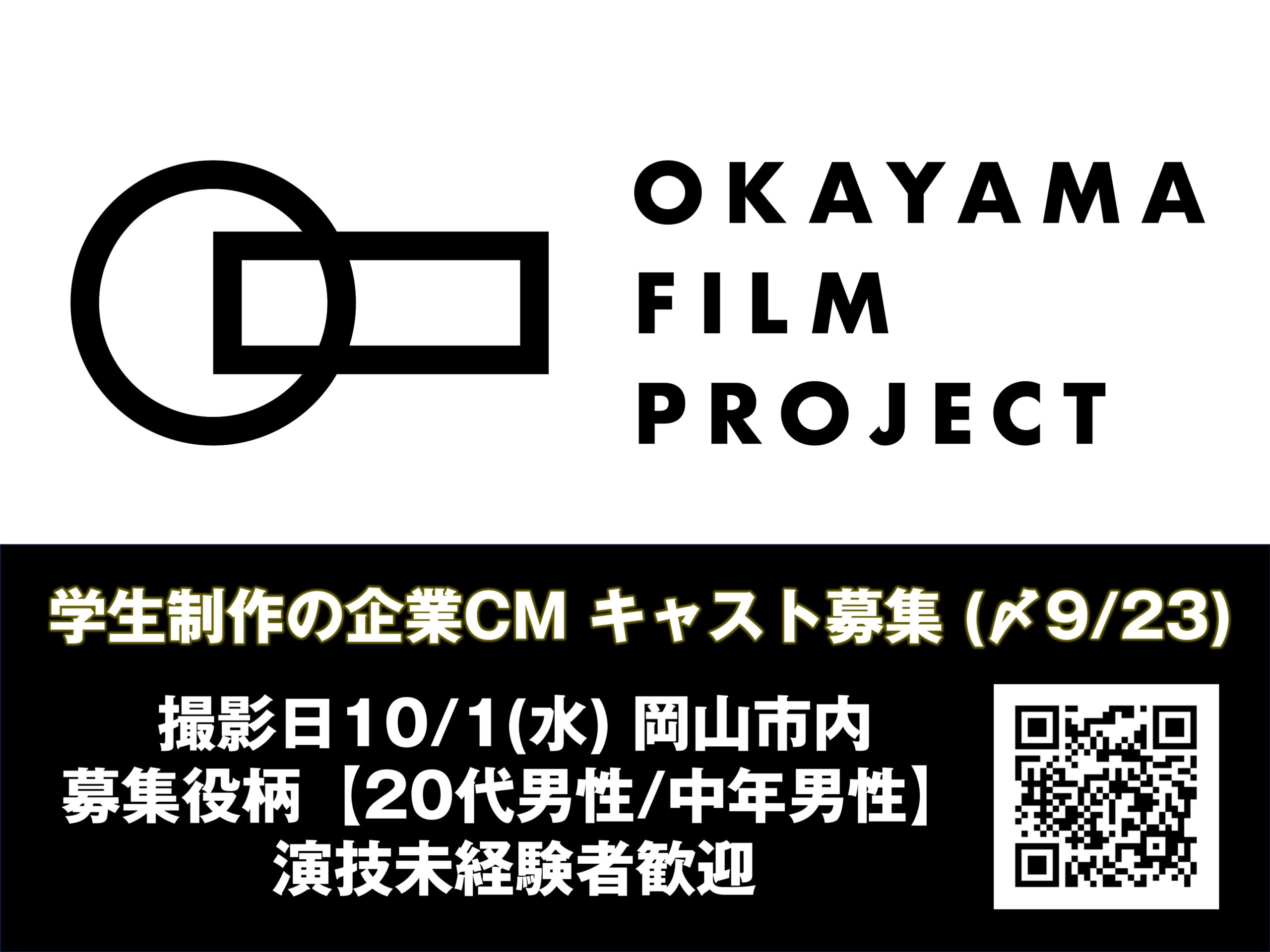 岡山フィルムプロジェクトでは、学生が主体となって企業WEB CMの制作を行っています。そこで、CMに出演するキャストを募集します。ぜひご参加ください!